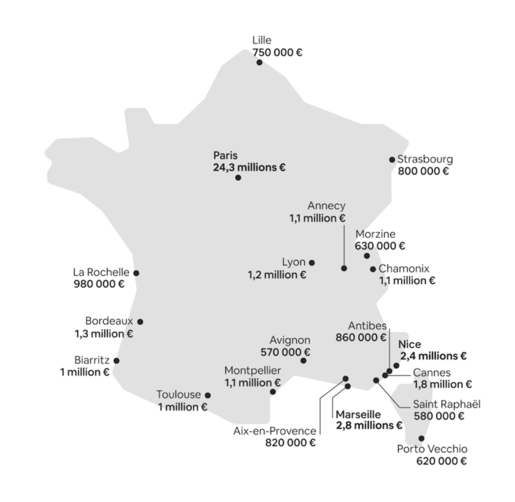 Les grandes villes profitent également de l’attrait des visiteurs internationaux et des événements, avec plusieurs millions d’euros reversés à Nice (5,6M€), Bordeaux (plus de 1,3M€), Marseille (plus de 3,2 M€) et Lyon (2,2M€).